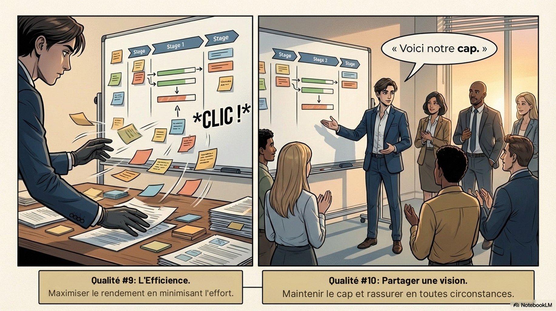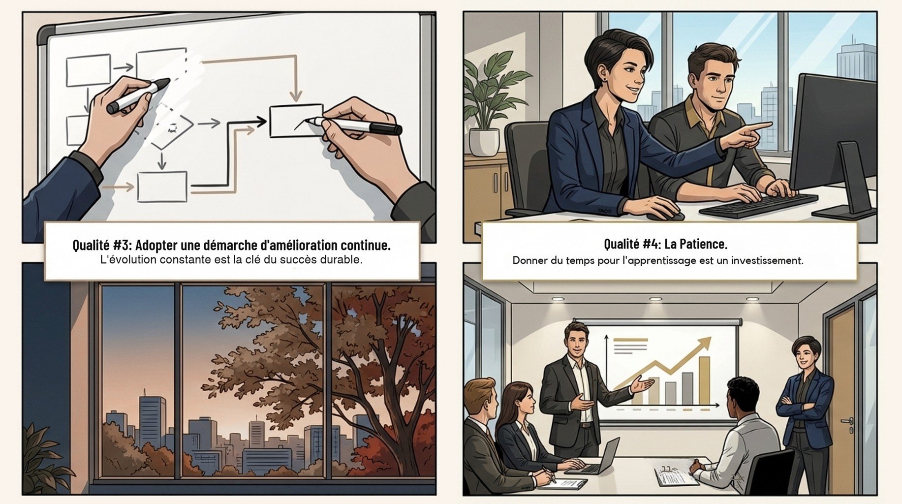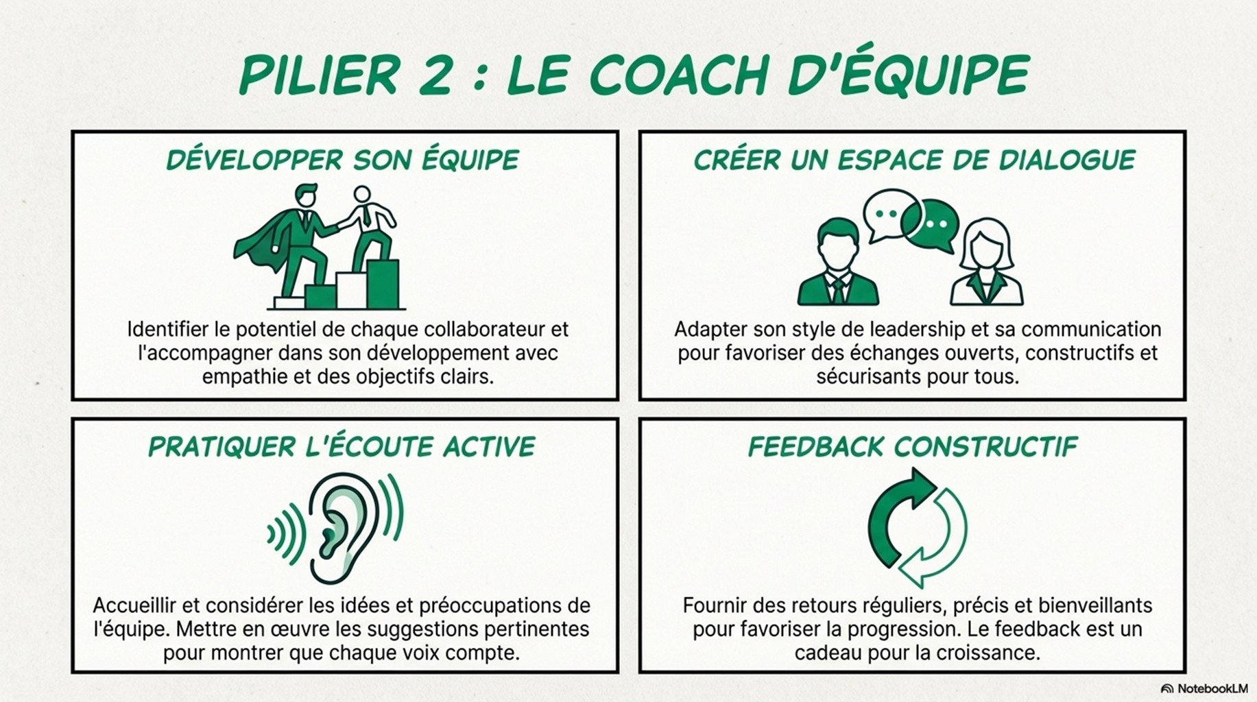 Vidéo pédagogique et 4 powerpoint centrés sur 11 qualités managériales clés, traduites en comportements observables, outils et rituels opérationnels. Application immédiate : objectifs, priorisation, communication, feedback, délégation, pilotage par indicateurs, résolution de problèmes, décision, gestion de conflits, coaching et amélioration continue. Utilisable en auto-formation ou comme support de session présentielle.